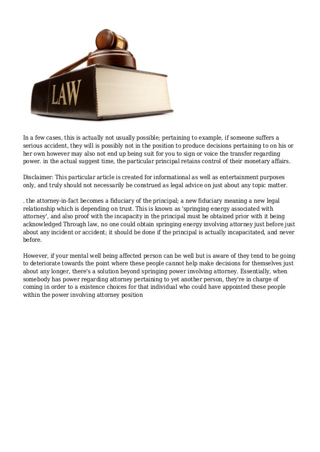 Ask the Lawyer: Power of Attorney, Guardianship and Representative Payee By Anne ensuring protection of the individual's rights. The springing durable power of attorney should not contain ambiguous the power of attorney must have legal capacity (i.e., appreciate the nature of his/her ... Read Content
